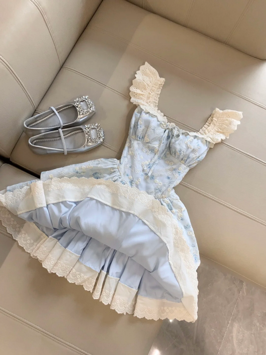 Light Blue Princess Dress with Ruffle Sleeves Sweet Puffy Birthday Skirt L24